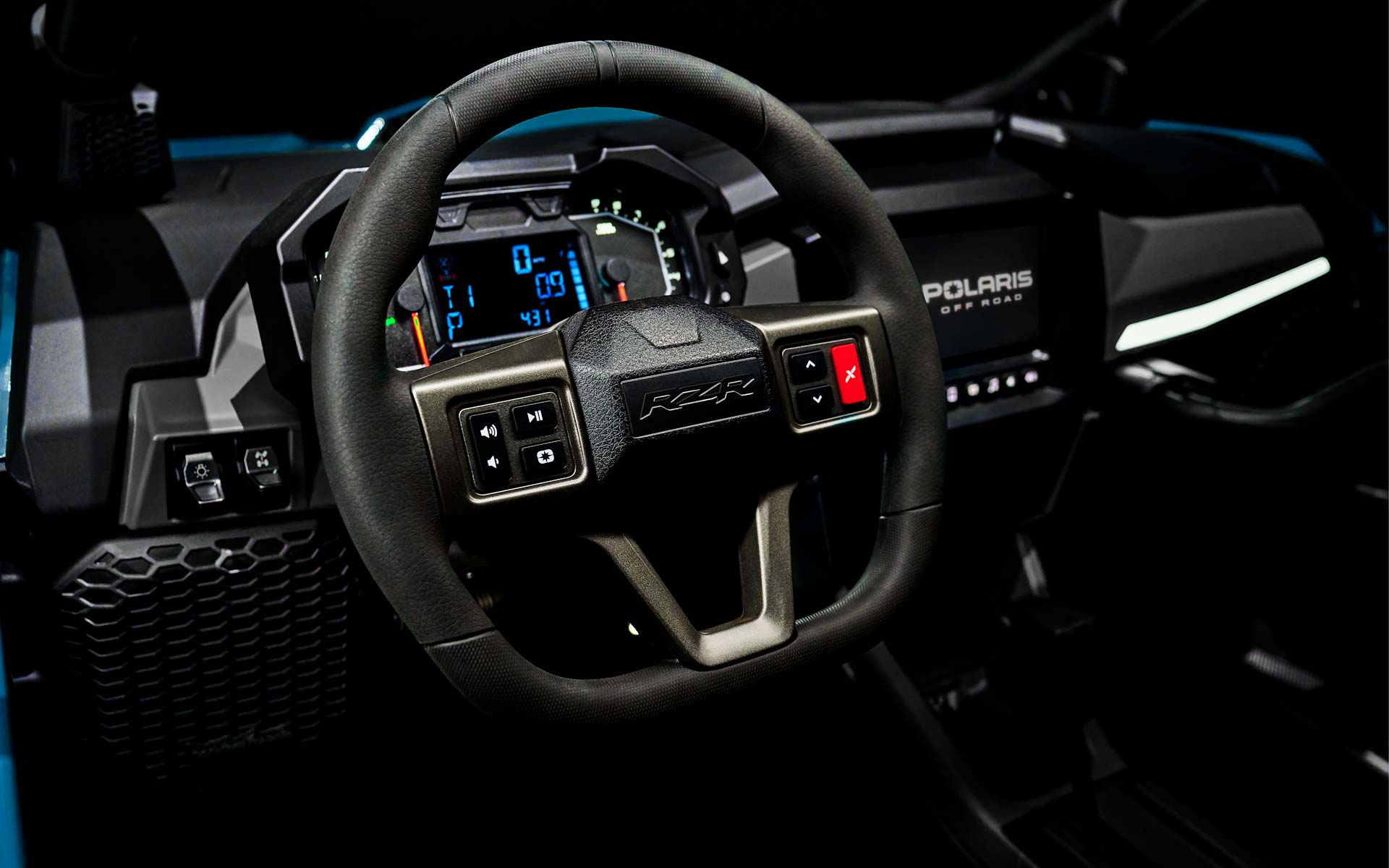 « Écran RIDE COMMANDMD de 7 po avec touche tactile résistif : Visualiseur DYNAMIX 2.0, GPS intégré, conduite en groupe (par téléphone cellulaire ou GPS), cartographie topographique, connectivité Bluetooth et USB pour téléphone intelligent, radio AM/FM et météo (haut-parleurs requis - vendus séparément), communications à bord du véhicule possibles avec casques d'écoute Sena en option, système antivol P.A.S.S. de Polaris. Cadrans analogiques à double balayage avec centre d'information du pilote à écran LCD de 4'' : Rétro-éclairage et luminosité bleu/rouge sélectionnables par l'utilisateur, intervalles d'entretien programmables. Instrumentation numérique : Indicateur de vitesse, tachymètre, compteur kilométrique, totalisateur partiel, horloge, compteur d'heures, indicateur de vitesse, jauge de carburant, température du liquide de refroidissement, voltmètre, indicateur et codes d'entretien, témoin de rappel de ceinture de sécurité, indicateur de vitesse, prise de courant continu.